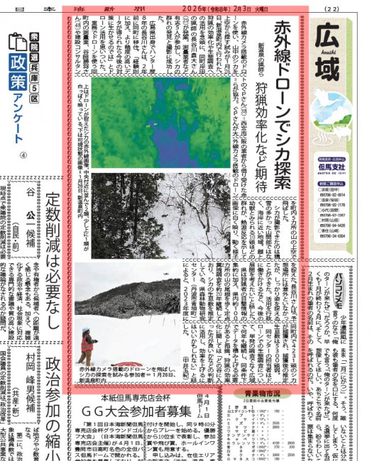 兵庫県新温泉町で、赤外線カメラ搭載のドローンを使ったユニークな取り組みが行われました。狩猟やシカの生態調査を目的としたこの実験に、BlueRay株式会社は赤外線ドローンの貸与という形で協力。革新的な技術で地域課題に貢献しています。